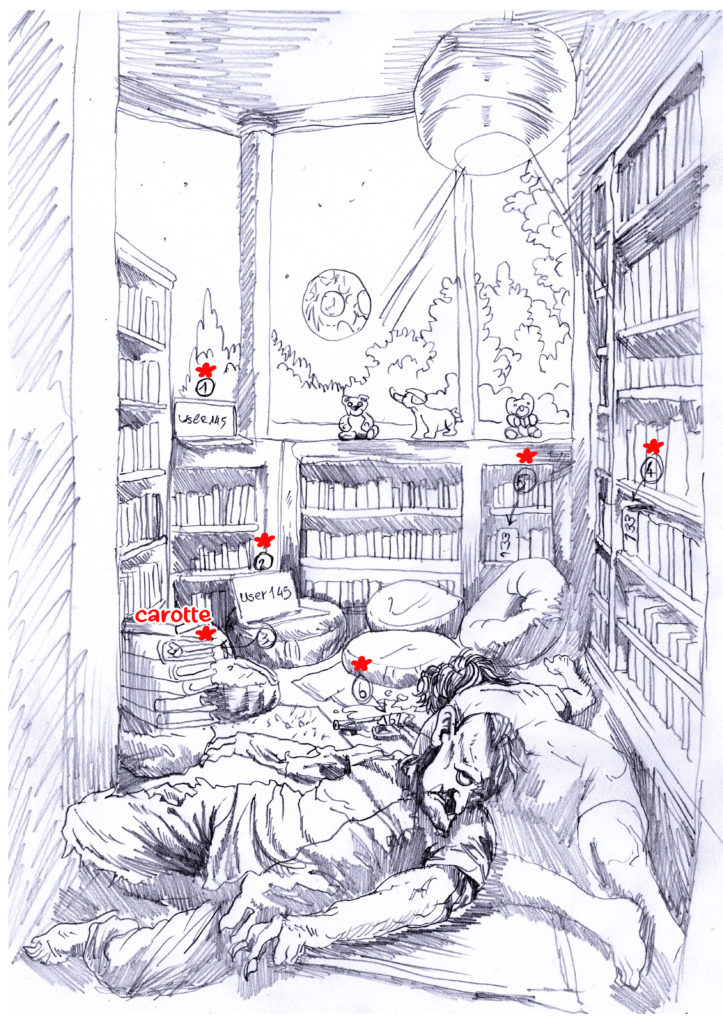 Même si toutes les illustrations ne possèdent d’indices ou d’éléments cachés, certaines demandent des astuces pour les intégrer et surtout des paramètres affinés pour faire en sorte qu’ils soient ni trop visible, ni trop dissimulé. Ce fut une grande source d’angoisse, d’essais et d’allers-retours, entre Shuky, Jérôme et moi. Donc si jamais vous avez du mal à en trouver certains, je suis sincèrement désolé car c’est un peu de ma faute …
