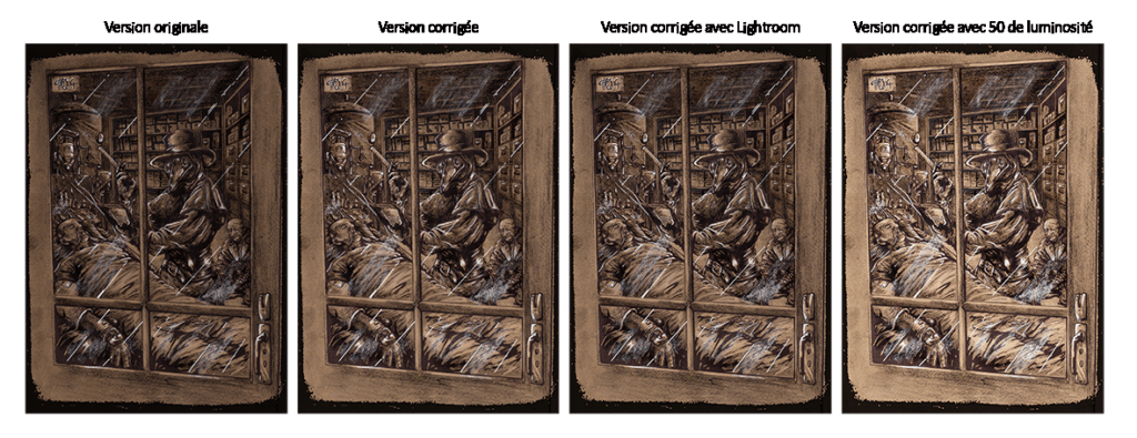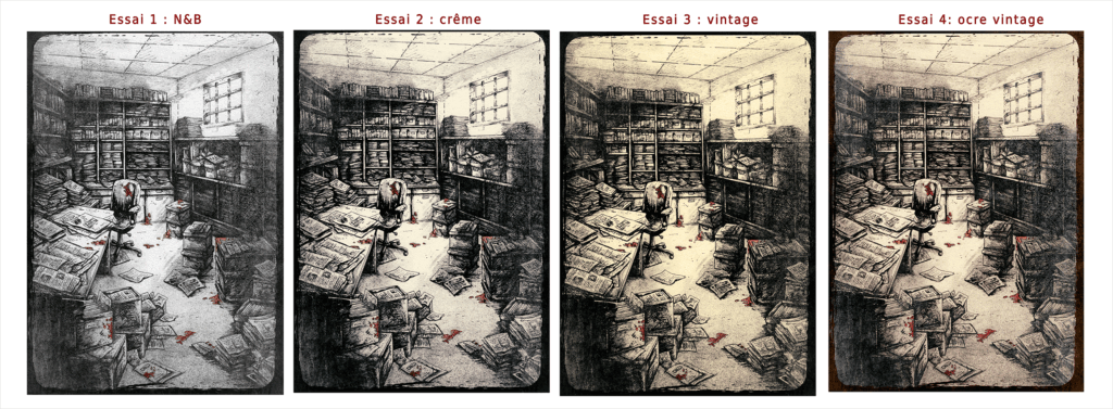 Ces ajustements de contraste et de lumière ne sont pas purement esthétiques, ils sont aussi indispensables pour la lisibilité ludique car il faut s’assurer que les indices cachés sont bien visibles sans être trop évidents et que l’ambiance ne nuit jamais à la clarté du gameplay. Un exemple du travail de luminosité effectué pour trouver le bon équilibrage qui passera à l’impression.